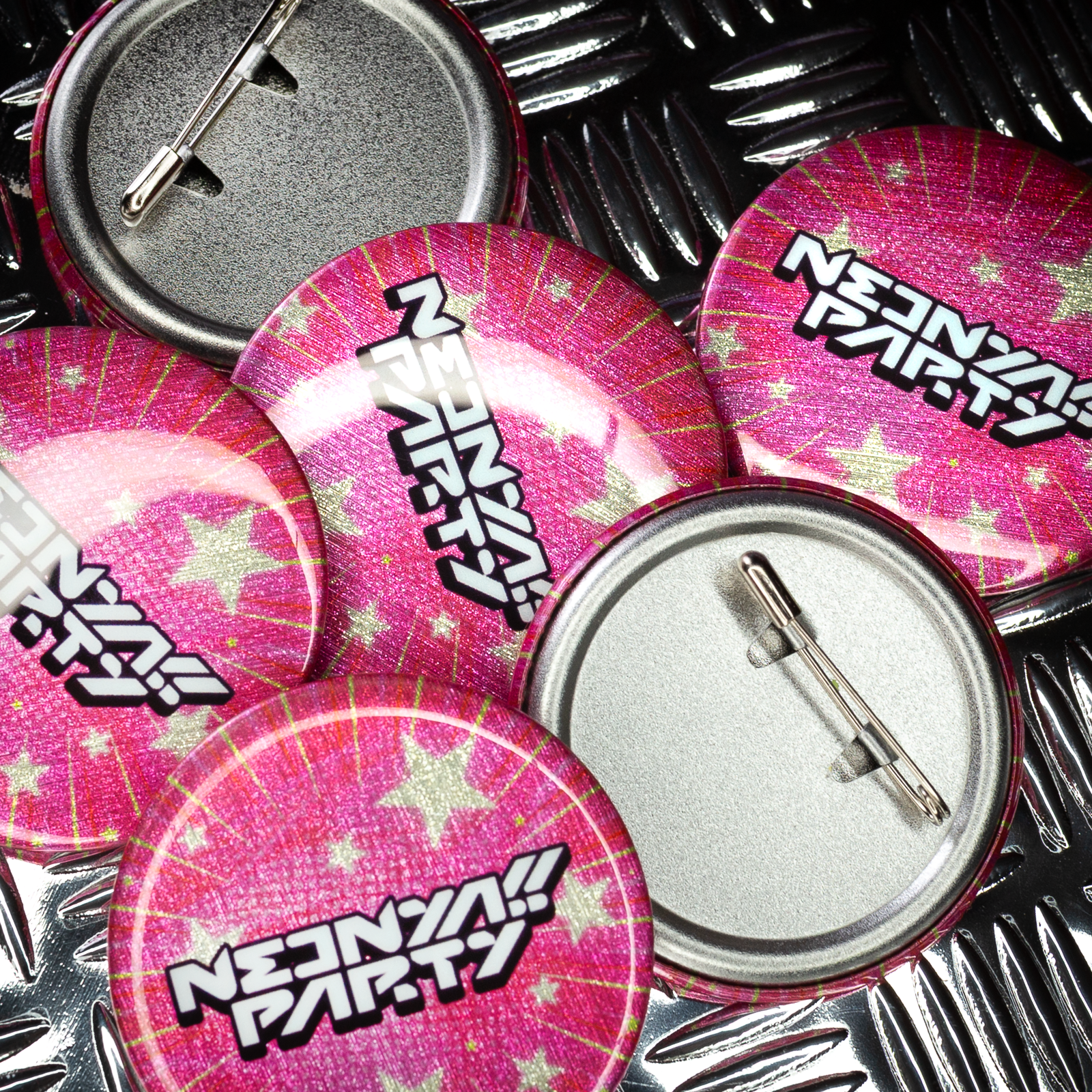 This collectible tinplate pin badge/button presents the Neonya!! Party 2025 logo on a screaming hot pink background, surrounded by yellow stars. An awesome way to rep the brand on a bag, backpack, cap, pants, or wherever else!