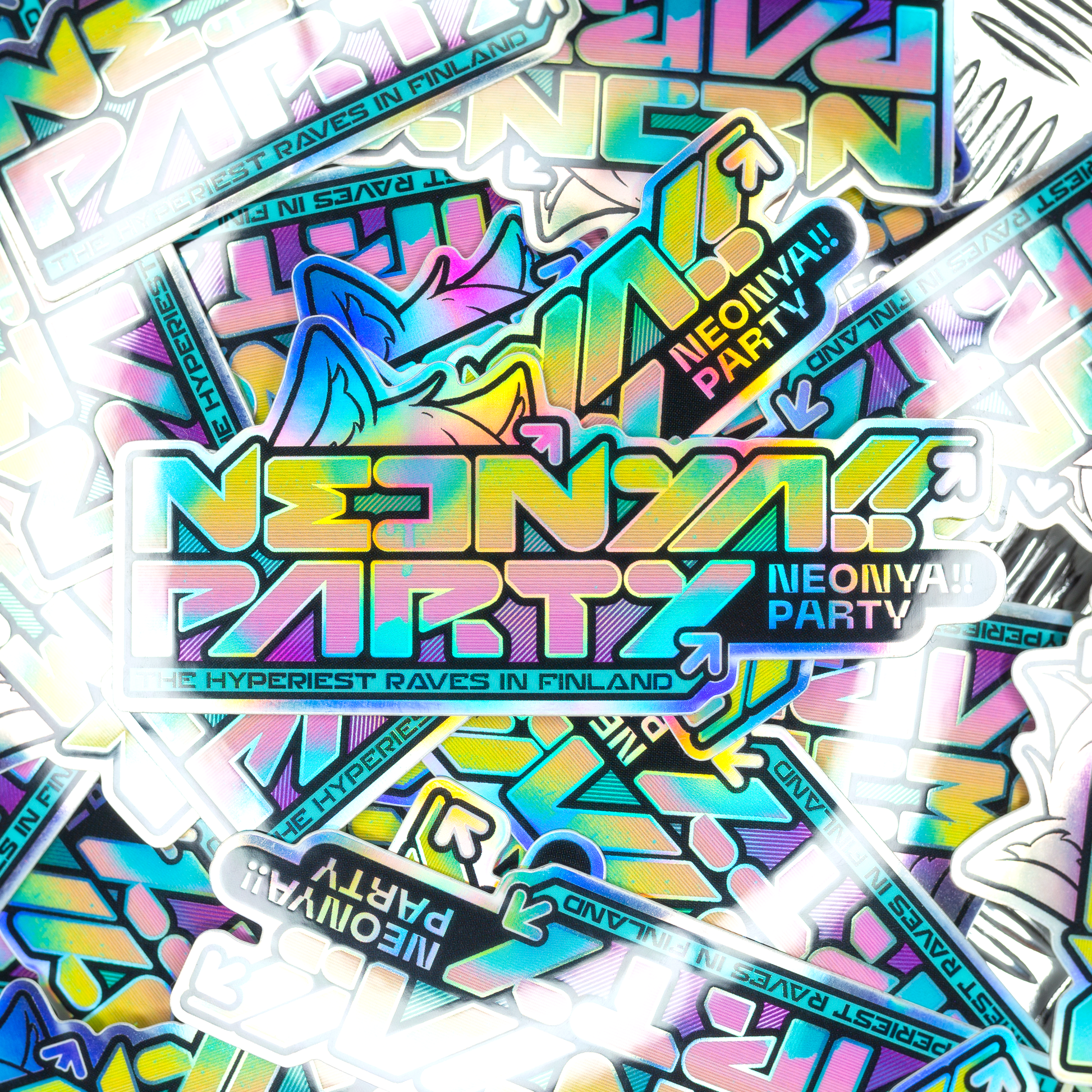 This high quality holographic Neonya!! Party logo sticker is printed on thick plastic with a protective coating and is perfect for almost any smooth surface.