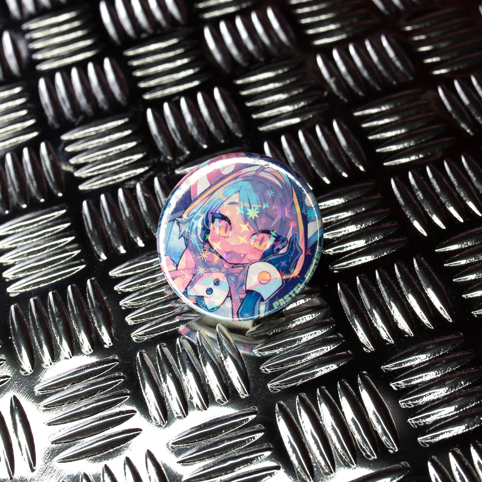The small badge measures 32mm across, and has a prominent star-shaped holographic effect cover the entire button.